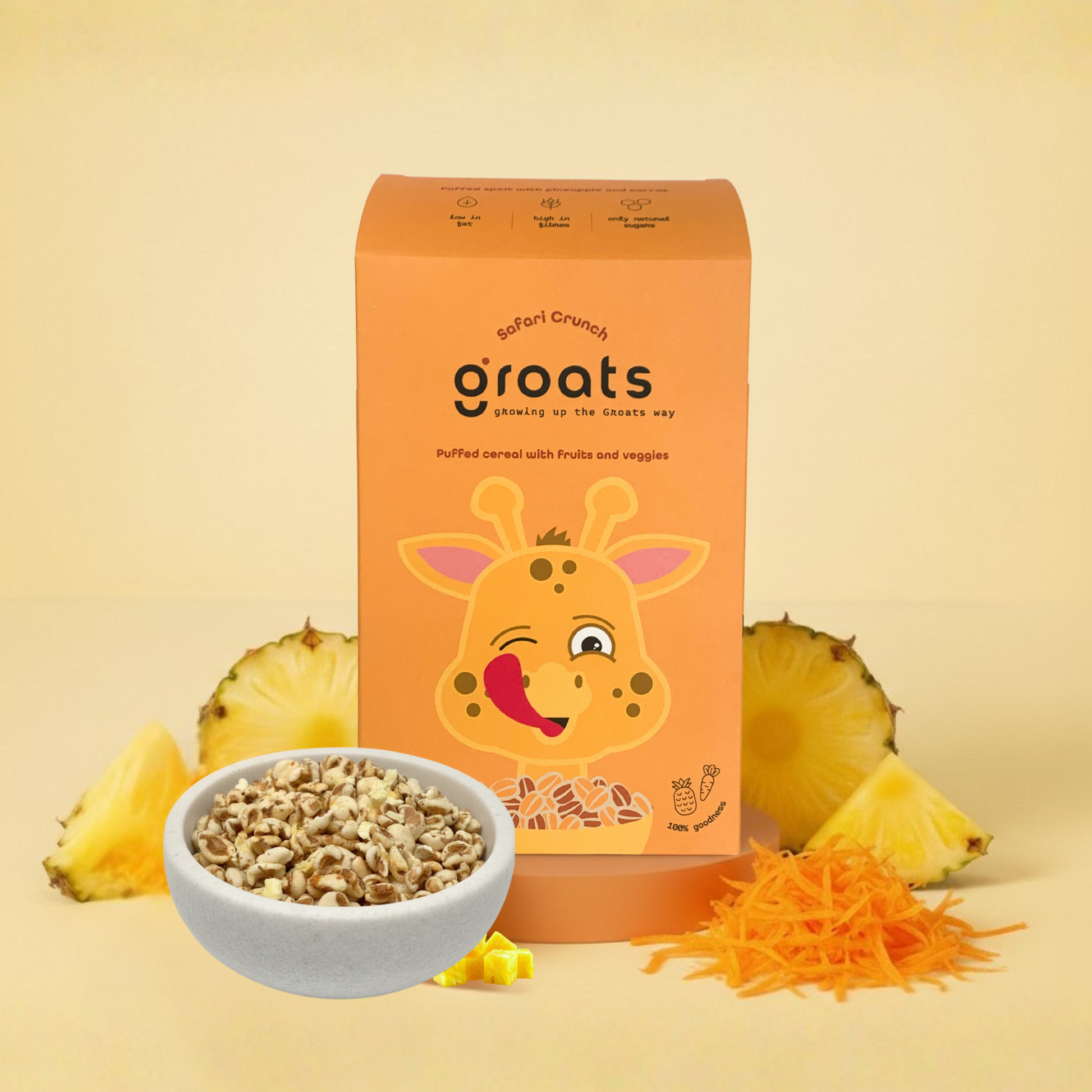 Gepofte spelt met oranjebloesemhoning, ananas en wortel.