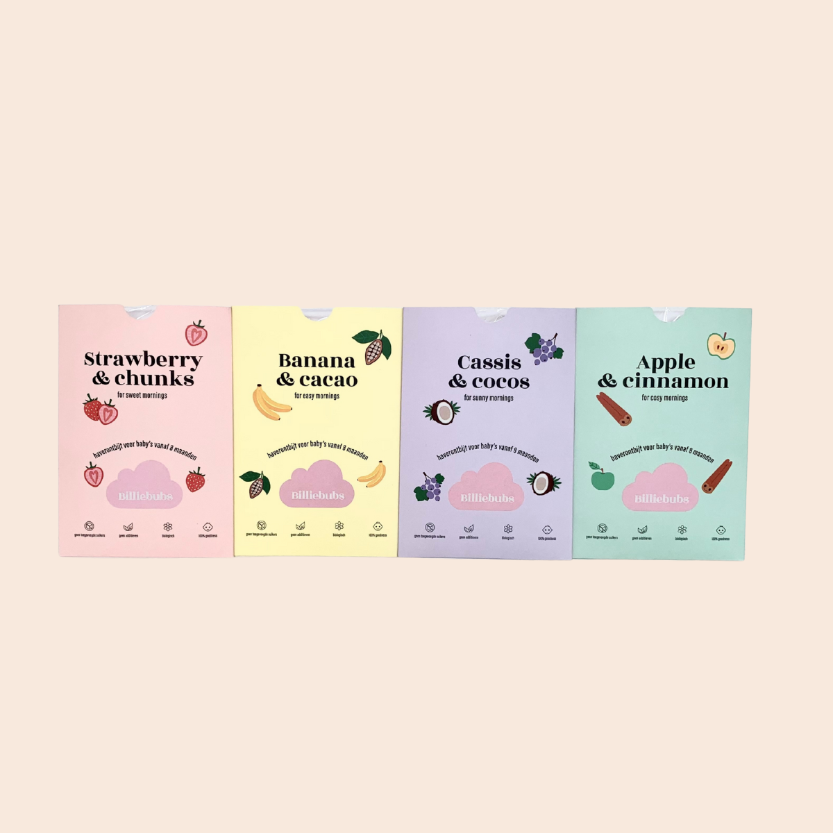 Nos petits déjeuners sont livrés en 10 (x30 grammes) petits déjeuners séparés dans une jolie jaquette dans la répartition suivante :