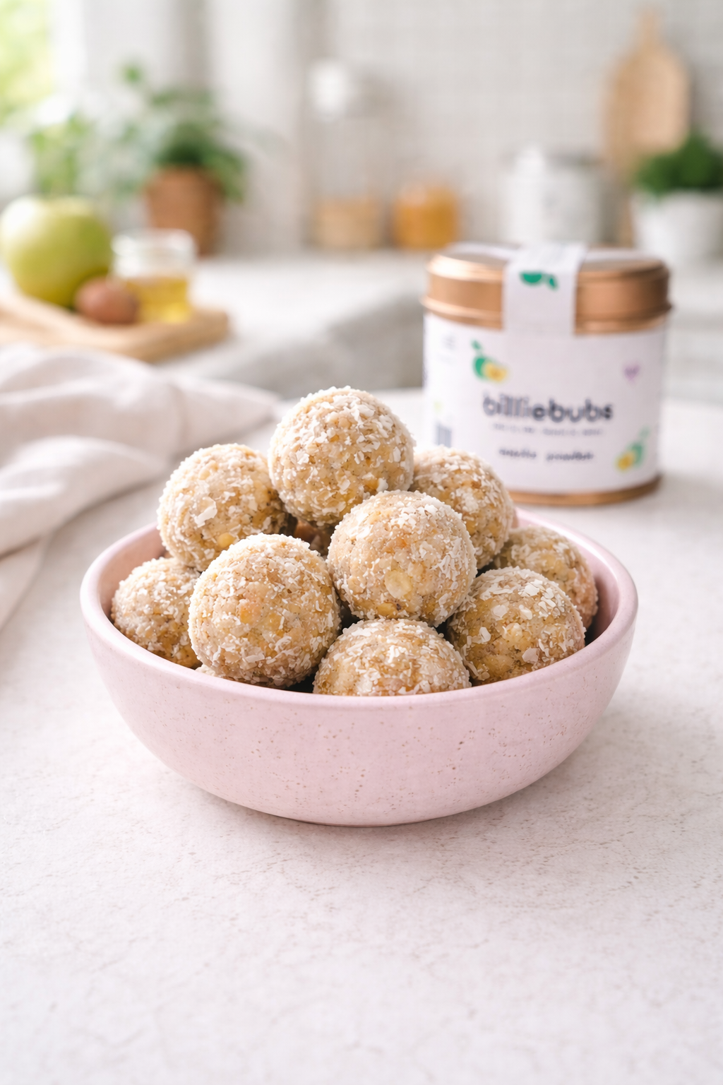 Heerlijke energieballetjes met dadels, havermout en appelpoeder.