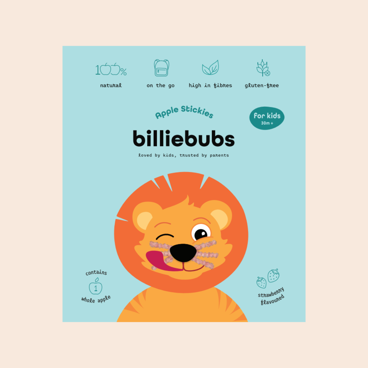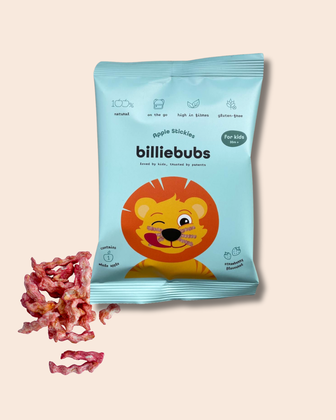 Heerlijke appel stickies met een coating van aardbei en rozenbottel in een handig on-the-go zakje voor kindjes vanaf 30 maanden. 1 zakje bevat een volledige appel!
