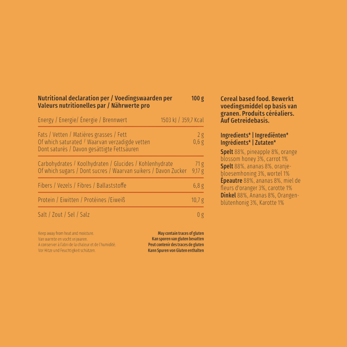 Gepofte spelt met oranjebloesemhoning, ananas en wortel.